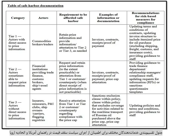 برای انطباق خدمات‌دهندگان با این سیاست، هم آمریکا هم اتحادیه اروپا سطوح مختلفی تعیین کرده‌اند تا هر حوزه خدمات‌دهنده از فروش نفت روسیه پایین‌تر از قیمت تعیین شده اطمینان حاصل کند. به طور مثال تاجران، واسطه‌گران و خدمات‌دهندگانی که مستقیما به عنوان خریدار یا فروشنده نفت روسیه اقدام می‌کنند به عنوان گروه اول هدف باید اسناد اصلی، فاکتورها و..را حفظ کنند تا درصورت لزوم برای تحریم نشدن یا ادامه اخذ خدمات از شرکت‌های اروپایی و آمریکایی ارائه کنند. در مورد موسسات مالی و گمرک‌ها به عنوان گروه هدف دوم نیز آورده شده که باید تلاش کنند اسناد خرید پایین‌تر از قیمت را به دست آورند و در غیرصورت باید اسناد مشخصی از خریداران دریافت کنند. دسته سوم که بیمه‌ها، مدیران کشتی‌ها و ثبت پرچم هستند نیز باید اسناد مشخص از خریداران دریافت کنند تا مشخص شود ارائه خدمات برای فروش نفت روسیه کمتر از سقف تعیین شده بوده است. بنابراین راهنمای اتحادیه اروپا و آمریکا سعی کرده