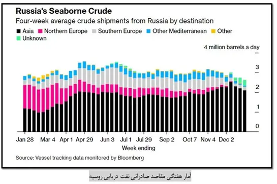 از دیگر آثار اعمال تحریم نفتی و سیاست سقف قیمت، چرخش بیشتر مقاصد صادرات دریایی روسیه از اروپا به آسیا است[35]. چنانکه براساس آماری که بلومبرگ منتشر کرده است، در هفته‌های مختلف ماه دسامبر ۲۰۲۲ مقاصد صادراتی نفت روسیه به مناطق مختلف اروپا کاهش چشمگیر داشته و در برخی مناطق از جمله شمال اروپا صفر شده است. این درحالی است که صادرات به مناطق آسیا در سطوح بالا حفظ شده