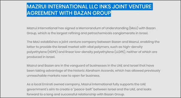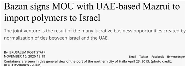 [1] https://www.jpost.com/israel-news/bazan-signs-mou-with-uae-based-mazrui-to-import-polymers-to-israel-649224#google_vignette