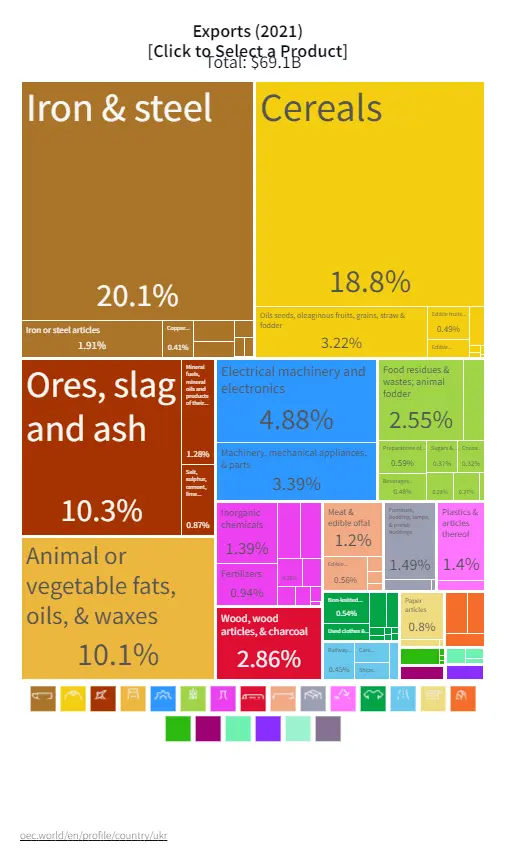 مشخصا دو بخش در اوکراین از لحاظ ایجاد درآمدهای صادراتی مهم هستند: اول، بخش صادرات غلات، دانههای روغنی و فرآوردههای آن که در سال 2021 حدود 38 درصد از ارزش صادرات این کشور را به خود اختصاص داده بود.