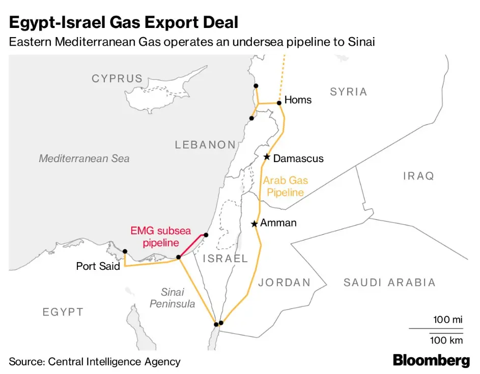 در سال 2019 لولهکشی گاز طبیعی از مخزن لویاتان به اردن و مصر آغاز شد. شرکت اسرائیلی New Med Energy و [2]Chevron به همراه ایست گاز مصر (Egyptian East Gas)، در امور مربوط به بهرهبرداری خط لوله EMG که گاز را از سرزمینهای اشغالی به مصر منتقل میکند، به منظور پیشبرد قرارداد صادرات گاز به مصر، با یکدیگر همکاری میکنند.