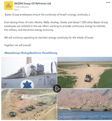 همچنین جزئیات گزارش سالانه 2020 گروه Delek نشان میدهد که سوخت خود را از پالایشگاه حیفا تامین میکند. در یکی از پستهای اخیر لینکدینِ گروه بازان (Bazan Group)[2]، که مالک پالایشگاه حیفا است، درباره «ارائه انرژی مستمر برای وسایل نقلیه، ارتش و کل اقتصاد انرژی» صحبت میکند.