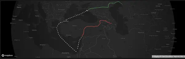 نقشه زیر مسیرهای خط لوله BTC (قرمز) که به بندر جیهان در ترکیه و خط لوله CPC (سبز) که به Novorossiysk در سواحل دریای سیاه روسیه ختم میشود و مسیرهای معمول حرکت نفتکش به سرزمینهای اشغالی (خطچین سفید) را نشان میدهد.
