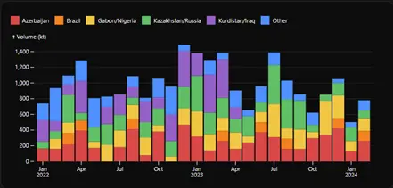به نظر میرسد که واردات نفت خام و مواد اولیه رژیم صهیونیستی نسبت به واردات محصولات پالایششده تحت تأثیر رویدادهای جاری قرار نگرفته است. نمودار زیر حجم نفت خام وارداتی در طول زمان را به تفکیک منطقه مبدا نشان میدهد. به استثنای جریان واردات نفت از کردستان عراق – که در بهار 2023 به دلیل اختلاف بین عراق، دولت اقلیم کردستان و ترکیه که مربوط به جنگ غزه نبود، قطع شد – در ماههای اخیر تغییر چندانی ایجاد نشده است.