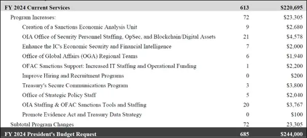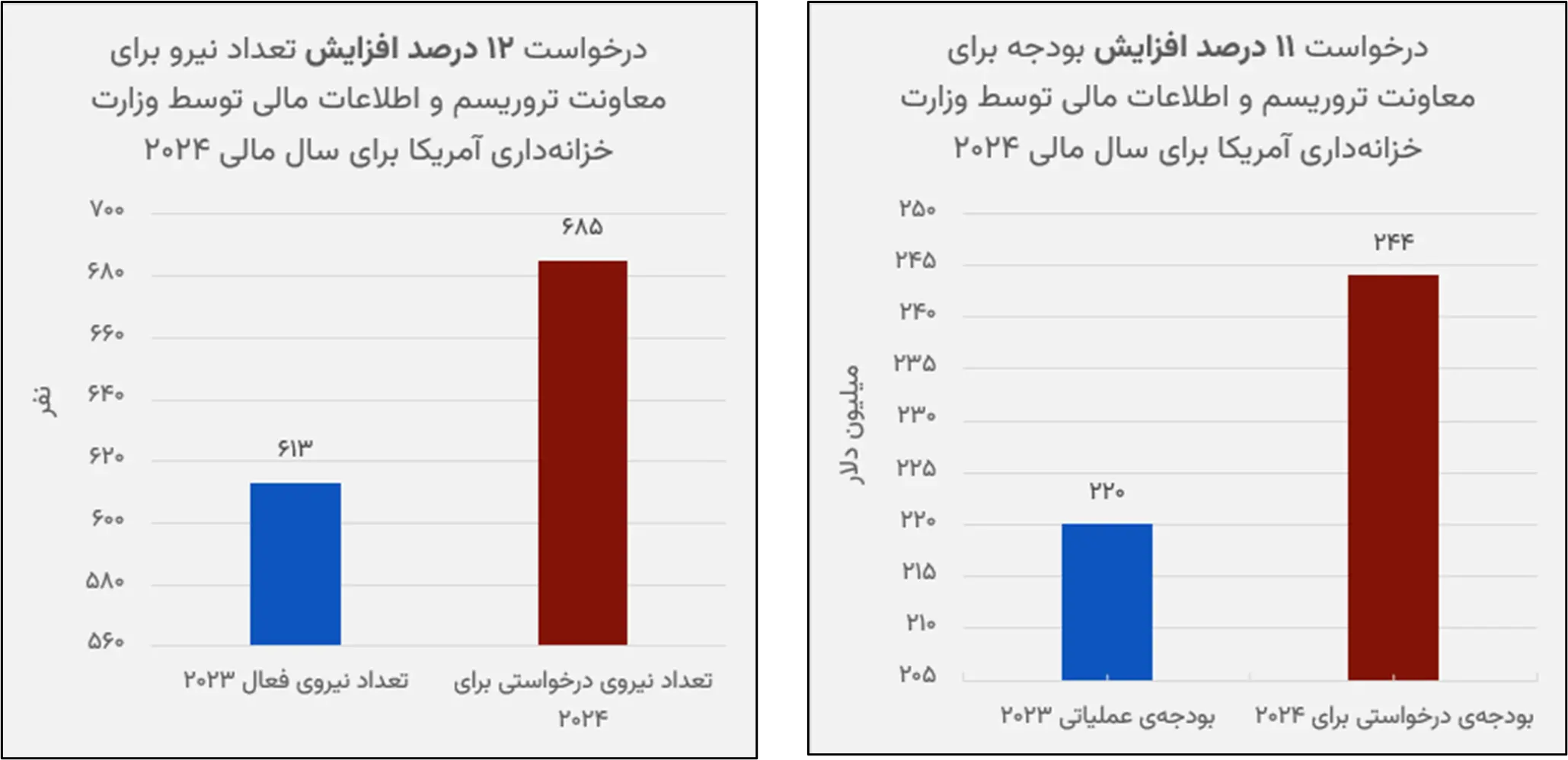عدد درخواستی وزارت خزانهداری برای سال ۲۰۲۴ (۲۴۴ میلیون دلار) در مقایسه با سال ۲۰۲۳ (۲۲۰ میلیون دلار) با افزایش حدود ۱۱ درصدی و تعداد نیروی درخواستی برای سال ۲۰۲۴ (۶۸۵ نفر) در مقایسه با سال ۲۰۲۳ (۶۱۳ نفر) با افزایش حدود ۱۲ درصدی مواجه شده است.