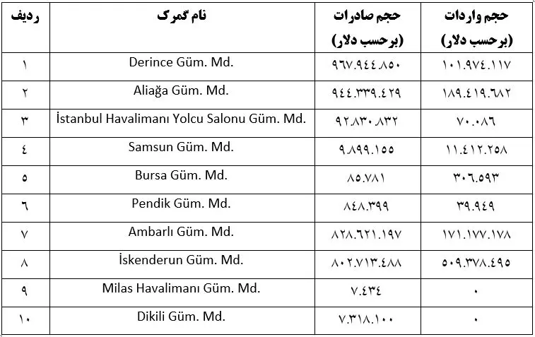 حجم تجارت 10 گمرک ترکیه که بیشترین تجارت را با رژیم صهیونیستی دارند