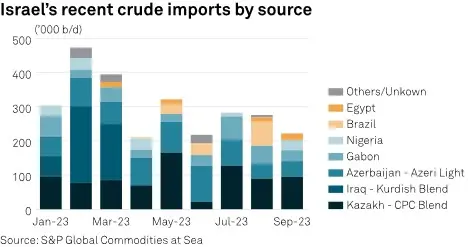 براساس داده های کپلر اکنون اسرائیل 220 هزار بشکه در روز وارد میکند که تامین کنندگان آن قزاقستان، آذربایجان، نیجریه، گابن، مصر و برزیل هستند. از این میزان سهم قزاقستان و آذربایجان از همه بیشتر است که مجموعا بیش از 60 درصد نفت مورد نیاز رژیم را شامل میشود.